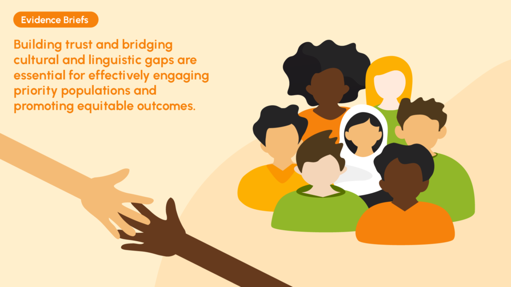 - Building trust and bridging cultural and linguistic gaps are essential for effectively engaging priority populations and promoting equitable outcomes.